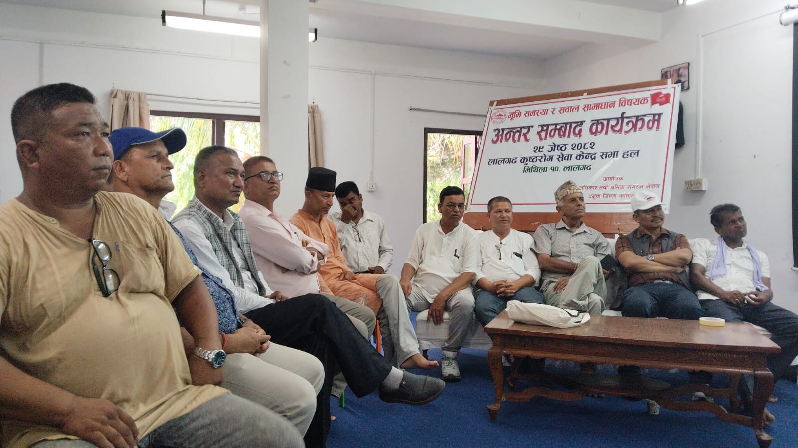 ढल्केबर, धनुषा । भूमिअधिकार तथा श्रमिक संगठन, नेपाल जिल्ला कमिटी धनुषाको आयोजनामा शुक्रबार धनुषाको मिथिला नगरपालिकास्थित लालगढमा ’भूमि समस्या र सवाल समाधान’ विषयक अन्तरसंवाद कार्यक्रम सम्पन्न भएको छ ।